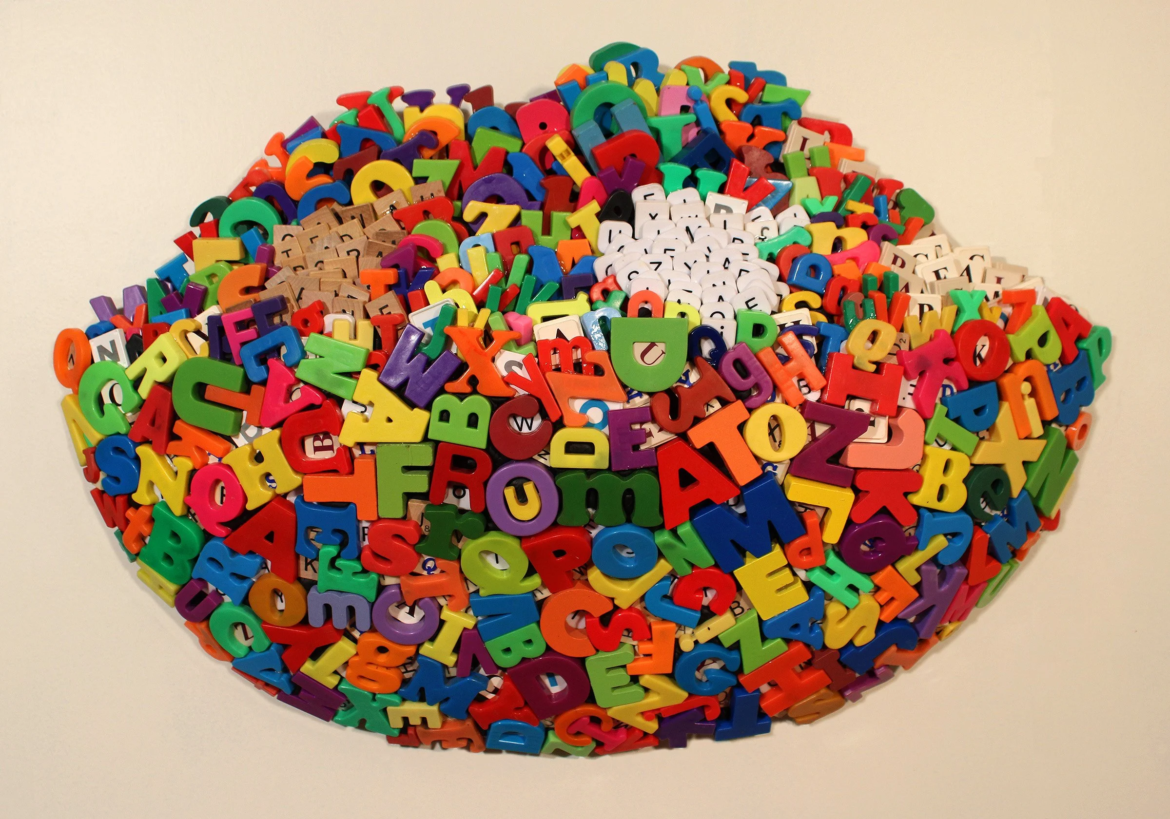 FROM A TO Z (detail), Found Plastic and Wood Letters, E-6000, Apoxie Sculpt, EZ Sculpt, Plywood, 17”H x 26”W x 5”D, 2025