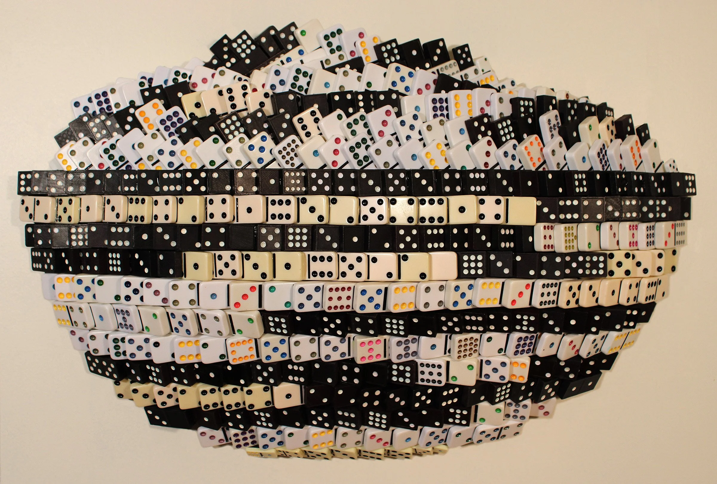 THE DOMINO EFFECT (detail), Domino pieces, E-6000, Apoxie Sculpt, EZ Sculpt, Plywood, 16”H x 26”W x 5”D, 2025