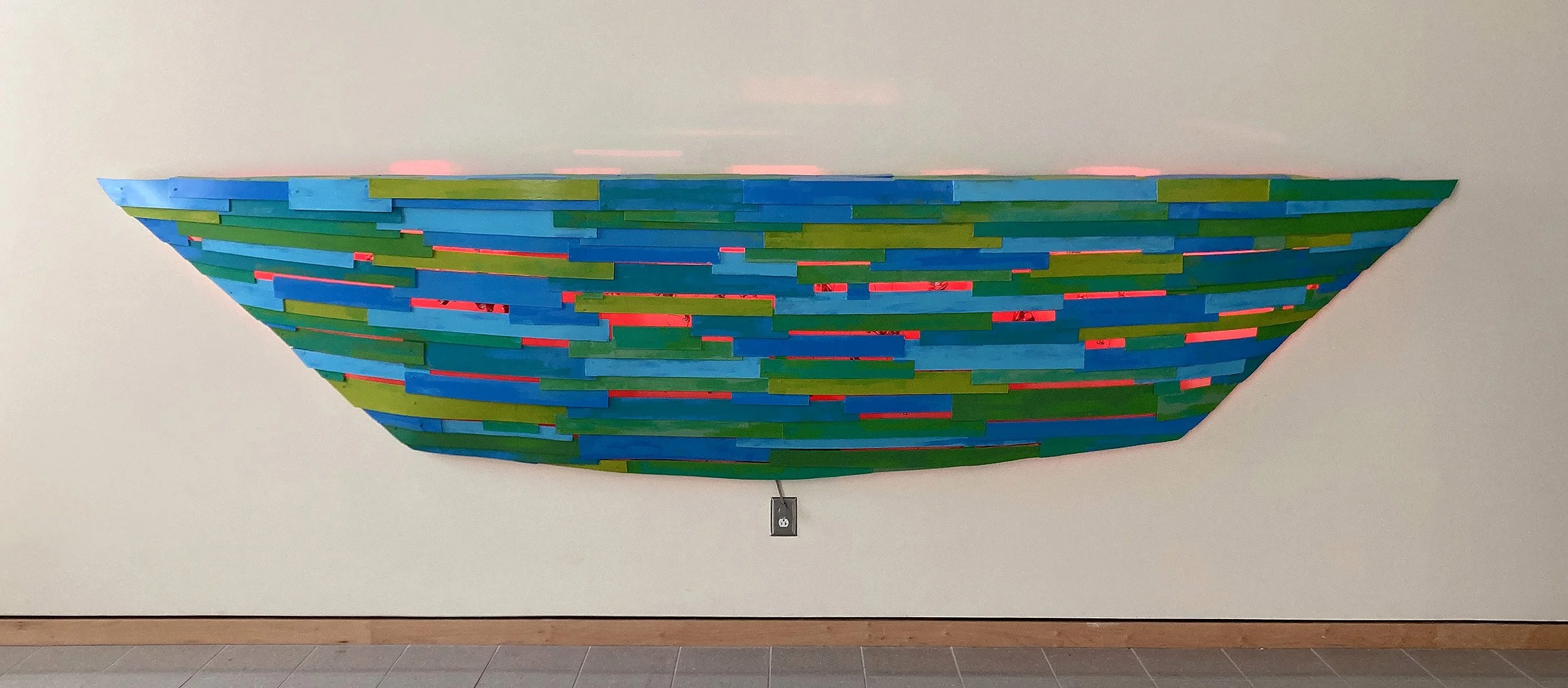Starboard Glow, Lumber, Hardware, Latex Paint, Neon Lighting, Suspended Interior Objects, 14’ 6”L x 3’ 7”H x 1’ 4”D, Wall Mounted